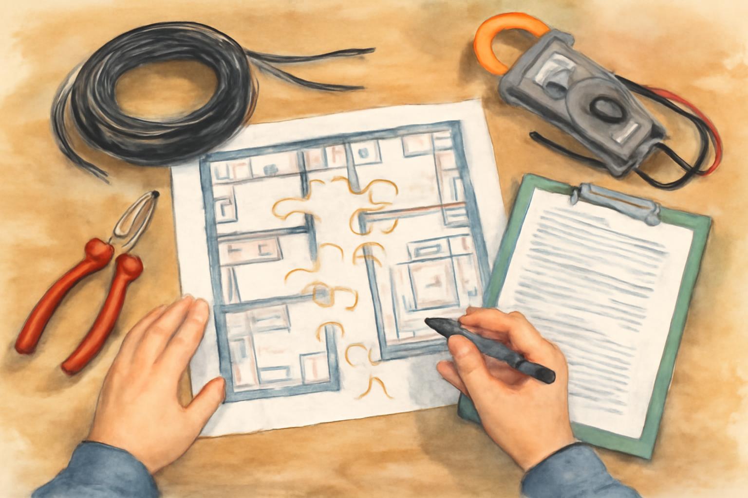 Этап 1 — сбор данных и нагрузок: - перечислить бытовые приборы по мощности; - составить список точек потребления (розетки, светильники, выключатели); - учесть будущие планы: перепланировки, добавления нагрузки (компьютеры, бытовая техника, климатическое оборудование); - составить схему размещения розеток и выключателей по помещениям.