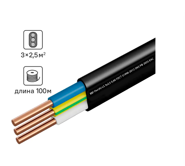 Кабель ВВГ-Пнг(А)-LS 3х2,5 мм² (ГОСТ, 100 м) от Калужского кабельного завода (ККЗ) – это силовой кабель с медными жилами, предназначенный для использования в системах электроснабжения с номинальным напряжением 0,66 кВ. Этот кабель обладает высокой пожарной безопасностью, так как имеет низкое выделение дыма и токсичных газов при горении (LS – Low Smoke).